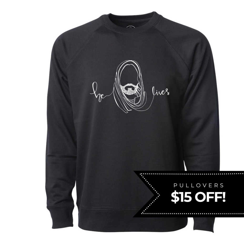 This stylish classic crew neck pullover is adorned with my original continuous-line ink drawing, "He Lives".