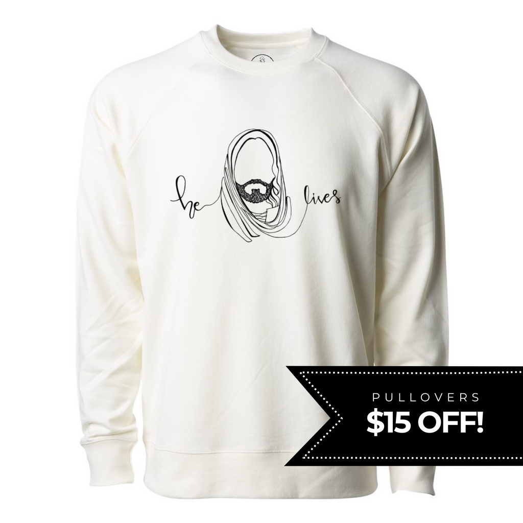 This stylish classic crew neck pullover is adorned with my original continuous-line ink drawing, "He Lives".